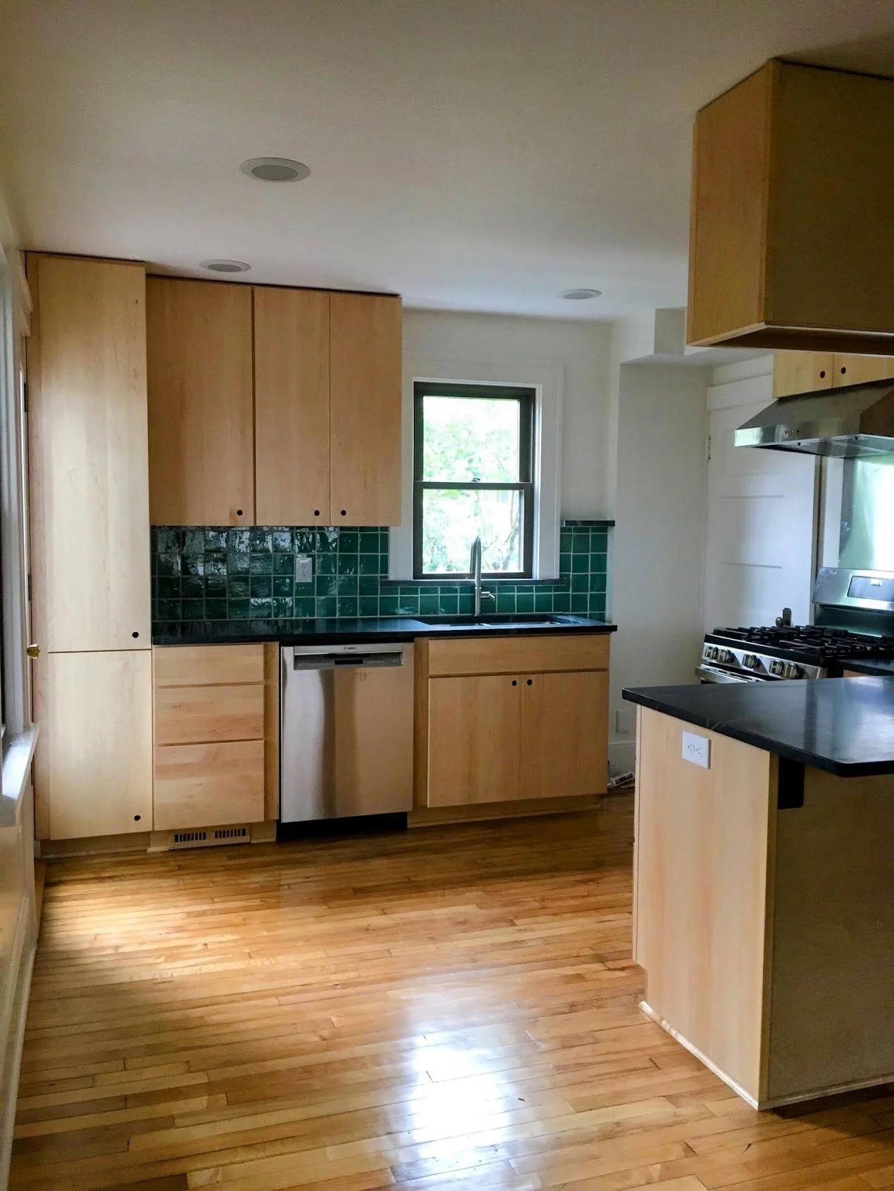 Opening the kitchen to the dining room is a classic project for us- many homeowners want more connection while they cook. What made this remodel stand out was the client’s clear vision for visual simplicity. Soapstone countertops and hardware-free cabinets creates a clean, natural look, while the green handmade tile backsplash adds vibrant pop of color.
